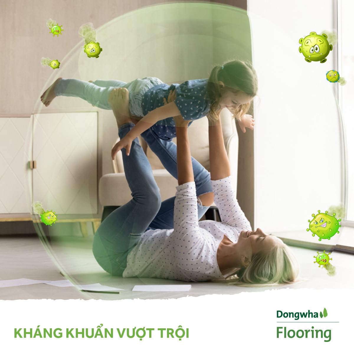 Bề mặt của sàn gỗ Sanus Dongwha được phủ lớp Nano Silver kháng khuẩn, đảm bảo 99,9% vi khuẩn không thể tồn tại trên bề mặt. Các ion bạc trong lớp phủ sẽ liên tục thực hiện nhiệm vụ diệt khuẩn, ngăn chặn sự phát triển của vi khuẩn gây hại. Điều này giúp duy trì môi trường sạch sẽ và an toàn cho trẻ nhỏ, mà không cần sử dụng các hóa chất kháng khuẩn có thể gây hại cho sức khỏe.