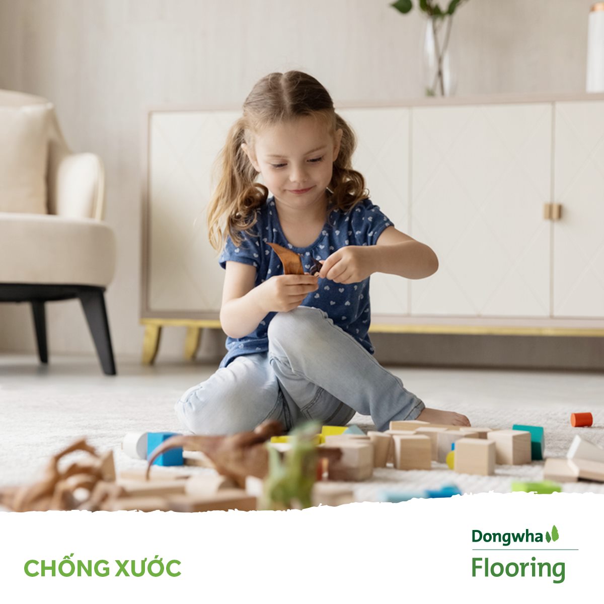 Trẻ nhỏ thường có tính hiếu động và tò mò, việc chơi đùa trên sàn gỗ không thể tránh khỏi những va đập, xước xát từ các đồ chơi hoặc hoạt động hàng ngày. Sàn gỗ Sanus Dongwha đáp ứng tiêu chuẩn AC3-AC4 về độ bền, cho phép sàn vẫn giữ được tính thẩm mỹ với vân gỗ tinh tế dù có những tác động mạnh từ trẻ em.